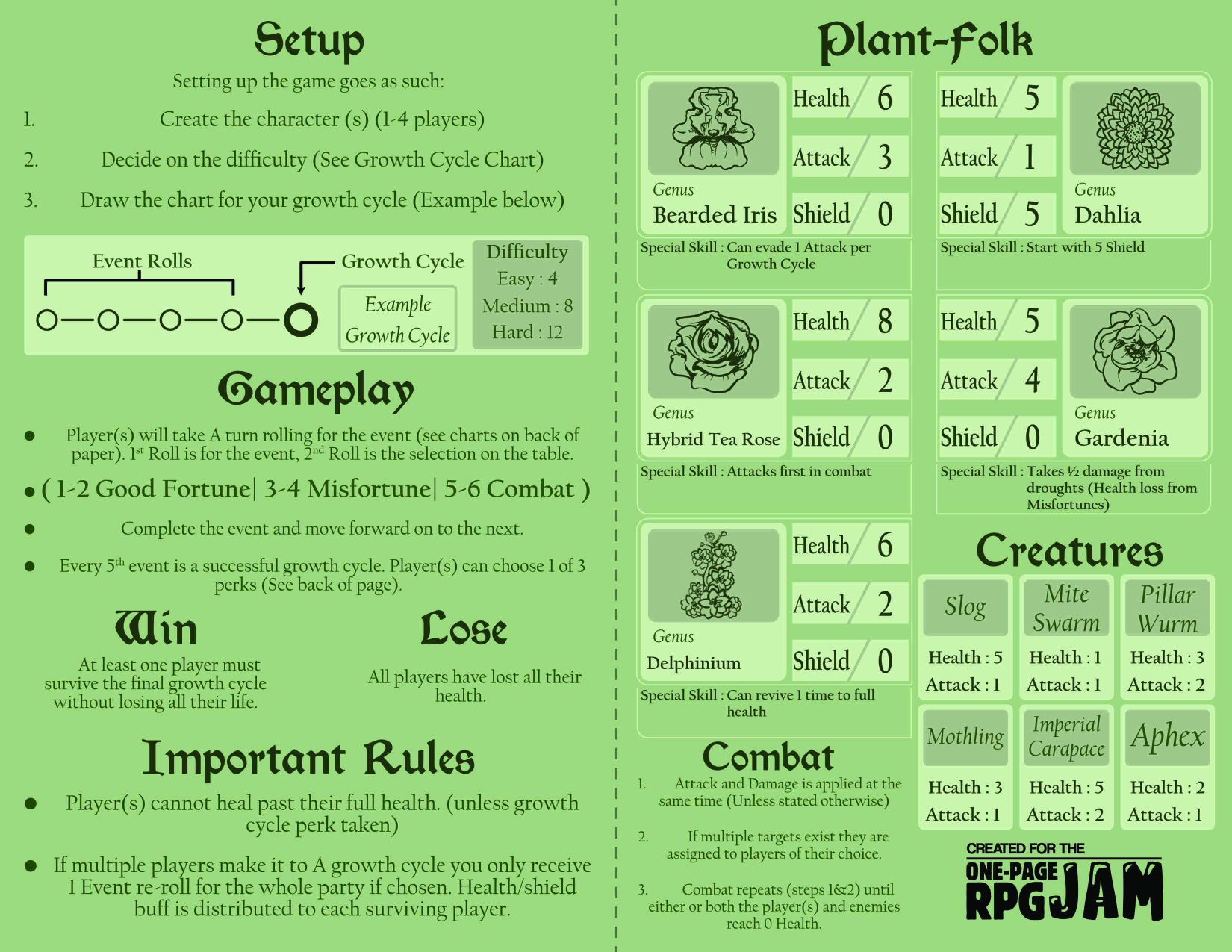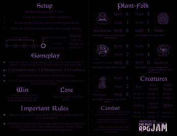 This is my first attempt at doing anything for the One Page RPG Jam! I did not have a ton of play testers so I expect some things to be broken or potentially confusing in the layout and wording of the PDF. I would love to hear everyone's feedback and critiques.